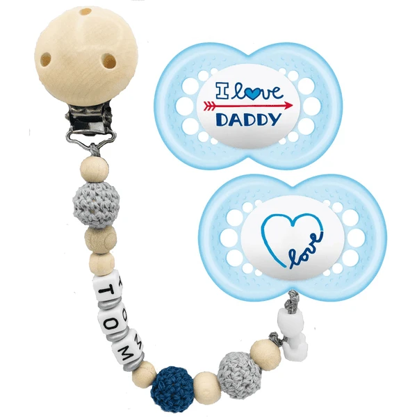 - Du bekommst 2 x original MAM Schnuller – I Love Daddy – im 2er Set Junge mit wunderschöner Schnullireich Schnullerkette mit Namen aus Naturholz und handgehäkelten Perlen