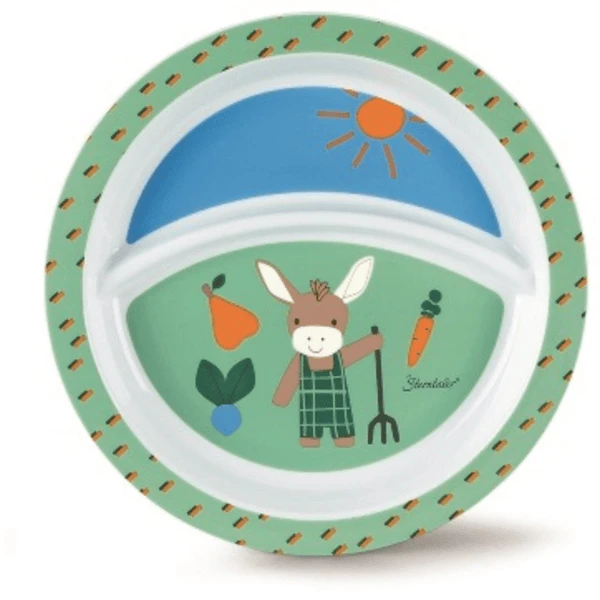 Ein schöner Kinderteller mit schickem Motiv Esel Emmilius. Mit rutschfestem